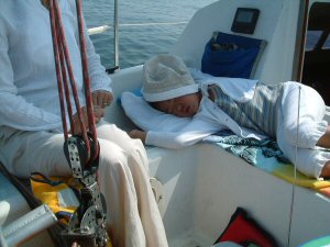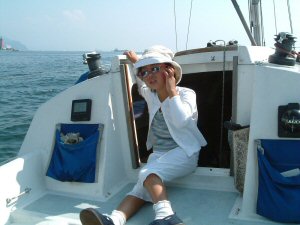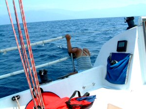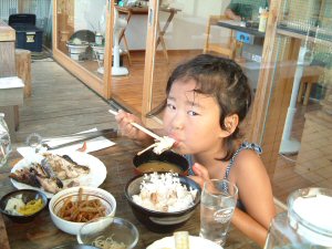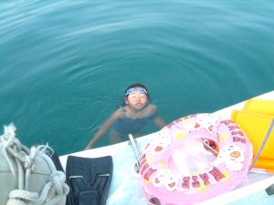 | 港近所の食堂で焼き魚定食。 | ヨットから飛び込みが大好きです。 | 初日は港近所の民宿へ泊まりました。 2日目はヨットへ泊まりましたが暑かった。 |