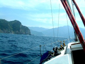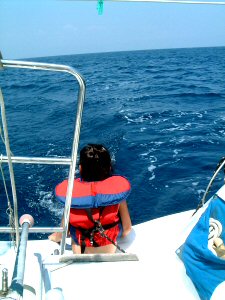 | ヨットの後部から足を海に浸けています。 蒼い海です。 |
