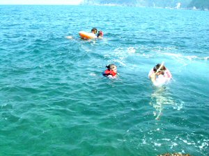 お母さんと一緒に。ニモは居るかな?。 | ライフジャケットと着けなくても泳げます。 潜るときれいな魚がイッパイ。 |